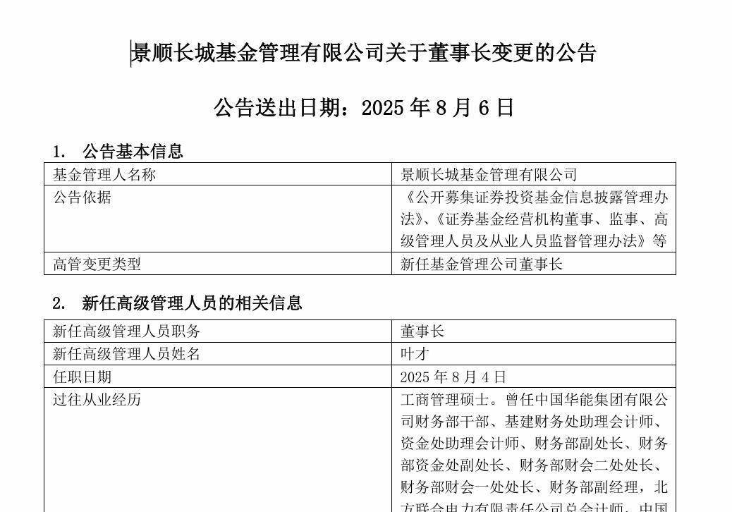 8月6日,景顺长城发布公告称,任命叶才为公司新一任董事长,任职日期为2025年8月4日。